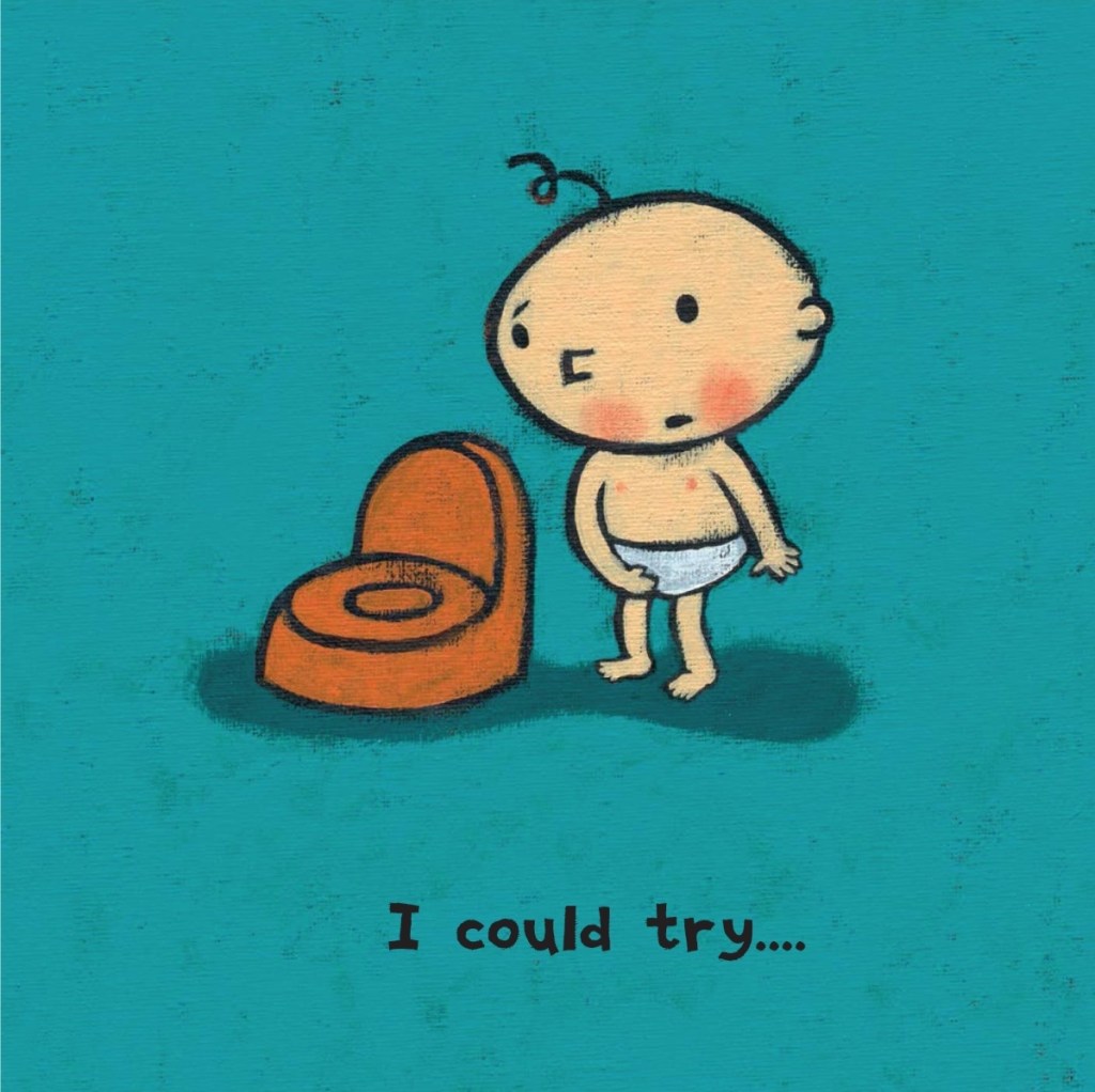 In this charming book that is overflowing with color, a child has their first “go” on the potty. Like many children going through the process, the main character starts off in their diaper. When they feel the urge to go, they weigh their options; diaper, sandbox, outside? They finally decide to try the potty…